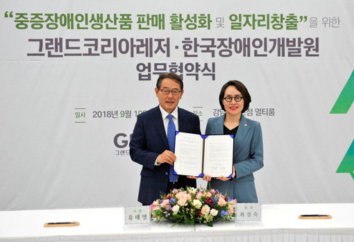 중증장애인을 지원하는 다양한 활동에 대한 협약식을 마치고 유태열 GKL 사장(왼쪽)과 최경숙 한국장애인개발원장이 기념촬영을 하고 있다.