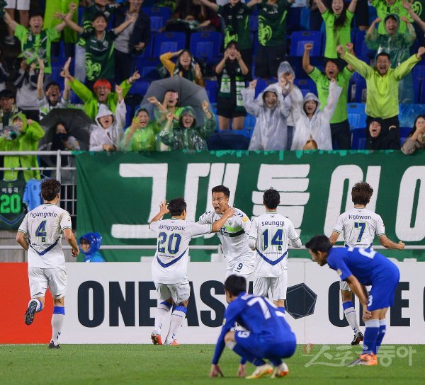 19일 수원월드컵경기장에서 열린 2018 AFC 챔피언스리그 8강 2차전 수원삼성과 전북현대의 경기에서 후반 전북 김신욱이 팀의 세 번째 골을 넣은 후 동료들과 함께 환호하고 있다.