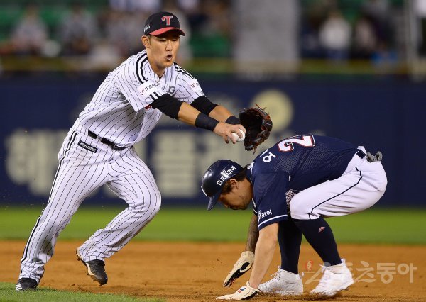 4회초 1사 1루에서 LG 2루수 정주현이 두산 정수빈의 2루수 앞 땅볼 때 2루로 향하는 오재원을 태그시키기 위해 팔을 내밀고 있다.