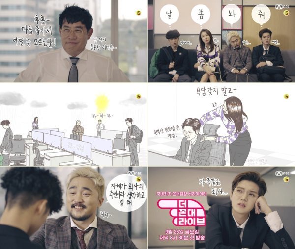 오는 28일 첫 방송에 앞서 5명의 MC들이 주위에서 자주 볼 수 있는 꼰대 문화를 실감나게 연기한 색다른 티저가 공개돼 많은 이들의 호기심을 자극하고 있다. 또한 일상 속 꼰대에 대한 고발을 담은 그림으로 소셜미디어 상에서 큰 인기를 얻은 일러스트 작가 ‘그림왕 양치기’와 콜라보한 이번 티저 영상은 직장인들의 애환을 재미있고 절묘하게 그려내고 있다.