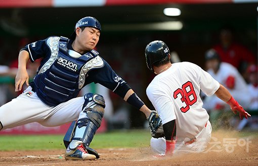 두산 베어스의 강점은 탄탄한 선발진, 강력한 타선과 함께 타 팀을 압도하는 수비력이다. 유일한 대항마로 꼽히는 SK 와이번스가 포스트시즌에서 특유의 장타력뿐 아니라 세밀한 야구에서 어떠한 완성도를 보여주느냐가 포인트다. 사진은 SK전에서 홈으로 쇄도하는 상대 주자를 태그하고 있는 두산 안방마님 양의지(왼쪽). 스포츠동아DB