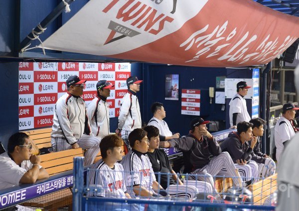 8회초 LG 덕아웃 선수들이 굳은 표정으로 경기를 지켜보고 있다.