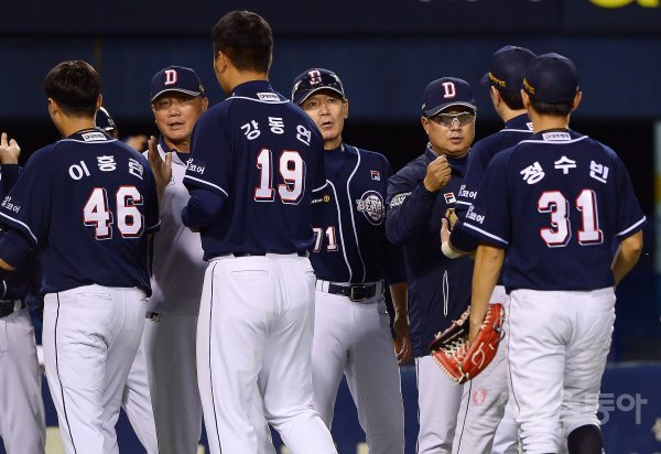 경기 후 두산 선수단이 기쁨을 나누고 있다.