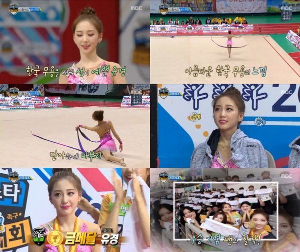 한복의 미를 살린 의상을 입고 등장한 유경은 \'아육대\' 리듬 체조 역사상 최초로 한국 가요를 선곡해 주목을 받았다. 이어 한국 무용 전공자 출신답게 아름다운 선과 턴 동작이 돋보이는 리본 공연으로 모두의 시선을 사로잡았다.