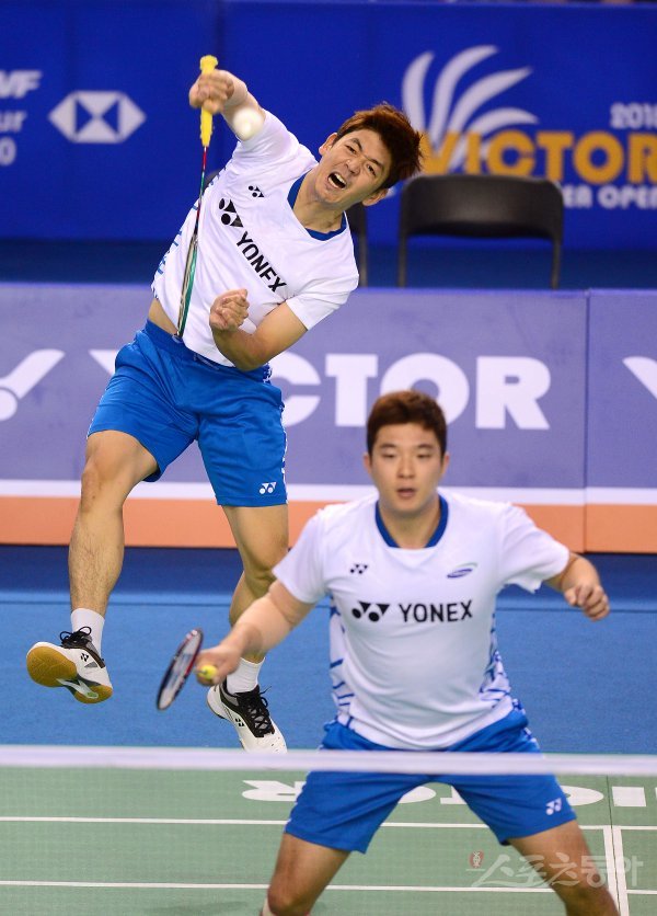 26일 서울 송파구 SK핸드볼경기장에서 열린 2018 빅터 코리아오픈 배드민턴 월드투어 본선 32강전에서 이용대(요넥스)-김기정(삼성전기) 조가 블라디미르 이바노프-이반 소조노프(러시아, 세계랭킹 16위) 조를 상대로 스매싱 공격을 하고 있다.