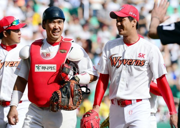 3회초 2사 2루에서 LG 이천웅의 안타 때 2루 주자 홍창기가 홈으로 파고 들다 SK 이재원에게 태그 아웃되자 이재원, 김광현이 미소를 짓고 있다.