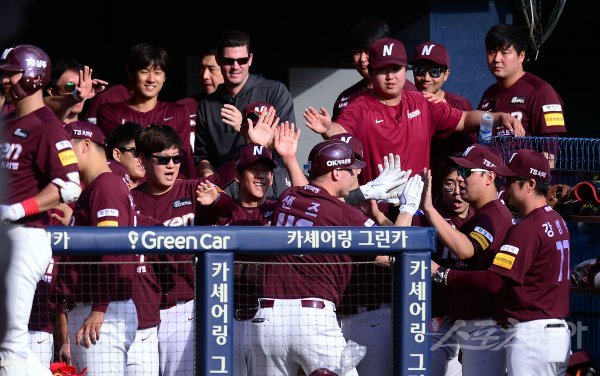 6회초 무사 1루 넥센 샌즈가 중월 투런 홈런을 날리고 그라운드를 돌아 홈인해 하이파이브 하고 있다.
