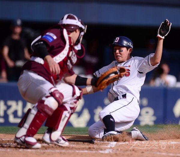 4회말 2사 1루 두산 허경민 우전 2루타 때 1루주자 정수빈이 홈까지 달렸으나 아웃되고 있다.