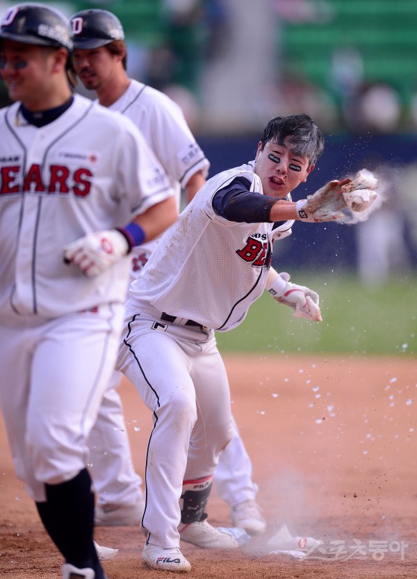 9회말 1사 1,2루 두산 박건우가 끝내기 안타를 치고 팀 동료들의 축하를 받고 있다.