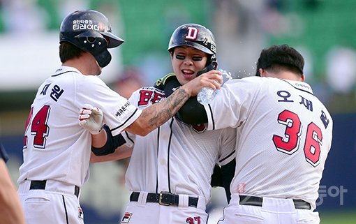 두산 베어스가 정규시즌 조기 우승의 기쁨을 다음 날 짜릿한 끝내기 승리로 이어 갔다. 박건우(가운데)가 26일 잠실 넥센 히어로즈전에서 9-8 승리를 만드는 9회말 끝내기 안타를 때려낸 뒤 오재원(왼쪽)과 오재일의 축하를 받고 있다. 잠실|김종원 기자 won@donga.com