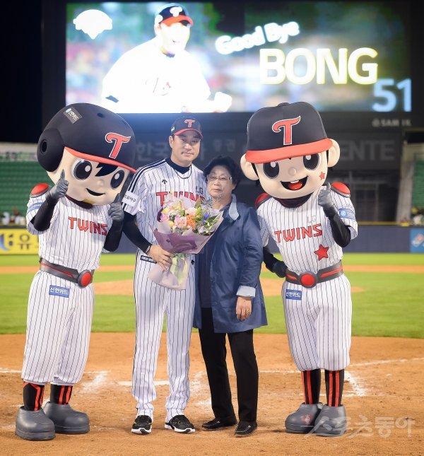 경기 후 열린 은퇴식에서 LG 봉중근이 어머니와 기념촬영을 하고 있다.