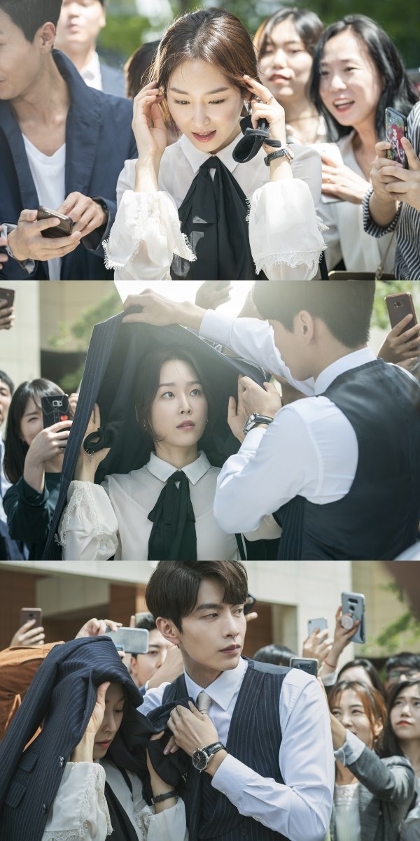 공개된 사진 속 한세계는 무방비로 인파에 둘러싸여 난감한 상황에 처해 있다. 쏟아지는 호기심 어린 시선과 카메라 세례에 어쩔 줄 모르는 한세계의 앞에 백마 탄 왕자처럼 나타난 서도재. 그는 재킷으로 한세계를 철통 보호하며 인파 사이에서 한세계를 단번에 구해낸다.