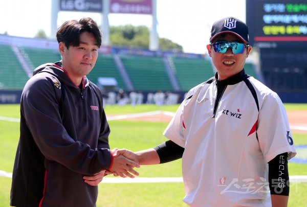 3일 서울 잠실야구장에서 열릴 ‘2018 신한은행 MY CAR KBO리그’ kt위즈와 LG트윈스 경기 전 2일 경기 도중 ‘보복 태클’ 논란을 일으킨 LG 양석환과 kt 박경수가 화해를 하고 있다.