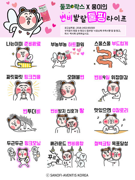 사노피 컨슈머 헬스케어 사업부 최유리 팀장은 “웹툰 속 친숙한 캐릭터가 담긴 둘코락스 핑크의 카카오톡 이모티콘이 변비 고민을 보다 자유롭게 소통할 수 있는 새로운 창구가 되어 보다 적극적인 변비 치료 방법을 찾을 수 있는 기회가 되길 바란다”고 밝혔다.