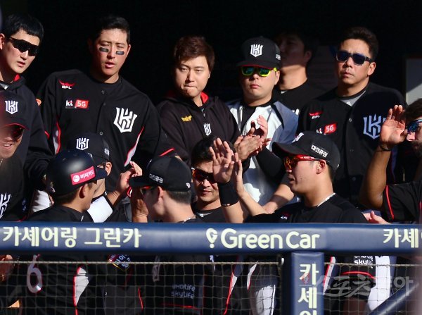 6회초 1사 2루 kt 윤석민 중전 안타 때 역전 득점에 성공한 박경수가 더그아웃에서 하이파이브하고 있다.
