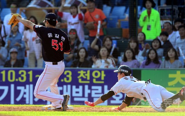 6회말 2사 1, 3루에서 한화 강경학이 내야땅볼을 치고 난 뒤 1루에서 슬라이딩을 시도했으나 아웃되고 있다.