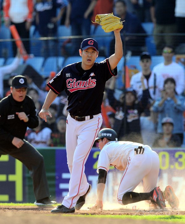 6회말 2사 1, 3루에서 한화 강경학이 내야땅볼을 치고 난 뒤 1루에서 슬라이딩을 시도했으나 롯데 윤길현에게 아웃되고 있다.
