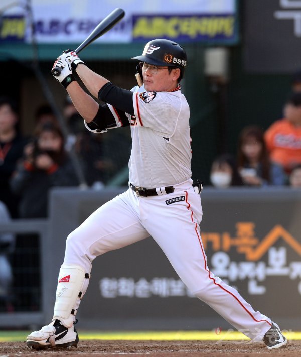 7회말 1사 만루에서 한화 이성열이 2타점 적시타를 날리고 있다.