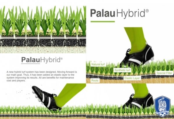 팔라우 하이브리드 시스템은 최하단 탄성층부터 특수필터, 인조잔디로 구성되고 천연잔디가 파종된다. 특히, 뿌리가 통과할 수 있는 탄성층이 특징으로 통기성이 뛰어나고 배수가 잘돼 관리가 용이하다. 또한, 충격흡수가 뛰어나 선수들의 부상 위험을 줄여준다.