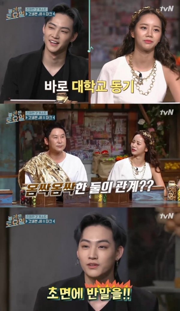 이에 JB는 "대학 동기"라며 "처음 보자마자 반말을 하더라. 자연스럽게 친해졌다"고 덧붙였다.