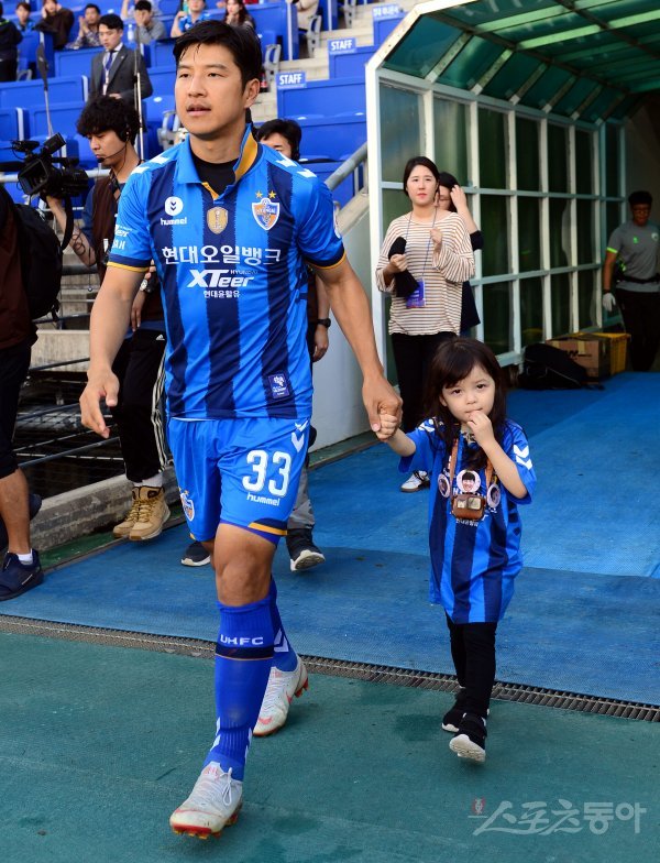 7일 울산 문수축구경기장에서 열린 ‘KEB하나은행 K리그1 2018’ 울산 현대와 전북 현대의 경기에서 울산 박주호가 딸 박나은양과 함께 입장하고 있다.