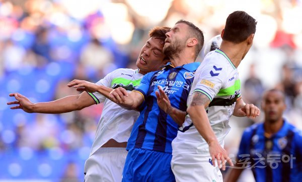 7일 울산 문수축구경기장에서 열린 ‘KEB하나은행 K리그1 2018’ 울산 현대와 전북 현대의 경기에서 울산 리차드가 전북 수비수와 공중볼을 다투고 있다.