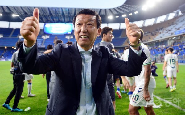 7일 울산 문수축구경기장에서 열린 ‘KEB하나은행 K리그1 2018’ 울산 현대와 전북 현대의 경기에서 전북이 정규리그 우승을 달성한 뒤 최강희 감독이 팬들을 향해 세리머니를 펼치고 있다.