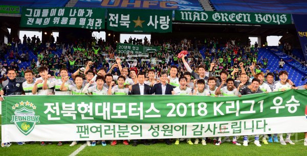 7일 울산 문수축구경기장에서 열린 ‘KEB하나은행 K리그1 2018’ 울산 현대와 전북 현대의 경기에서 전북이 정규리그 우승을 달성한 뒤 최강희 감독과 선수들이 기념촬영을 하고 있다.