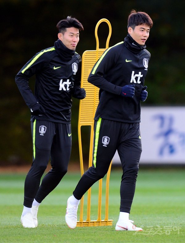 축구대표팀 손흥민과 기성용이 나란히 훈련에 나서고 있다.