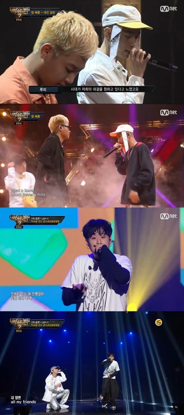 팀 배틀이 끝난 이후에는 본격적인 본선 1차 경연이 시작됐다. 무대에서는 TOP 12 래퍼들이 일대일로 맞붙게 되며 승자는 상대의 배틀 머니 전액을 차지하고 패자는 바로 탈락이다.