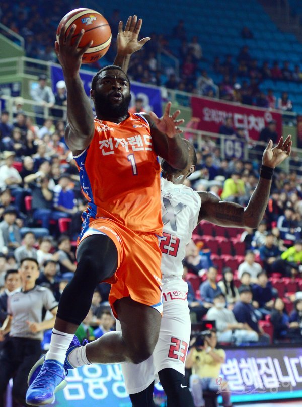 14일 인천 삼산월드체육관에서 열린 ‘2018-2019 SKT 5GX 프로농구’ 인천 전자랜드와 서울 SK의 경기에서 전자랜드 팟츠가 SK 바셋의 수비를 제치며 슛을 쏘고 있다.