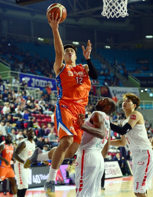 14일 인천 삼산월드체육관에서 열린 ‘2018-2019 SKT 5GX 프로농구’ 인천 전자랜드와 서울 SK의 경기에서 전자랜드 정효근이 SK 윌리엄스를 앞에 두고 슛을 쏘고 있다.