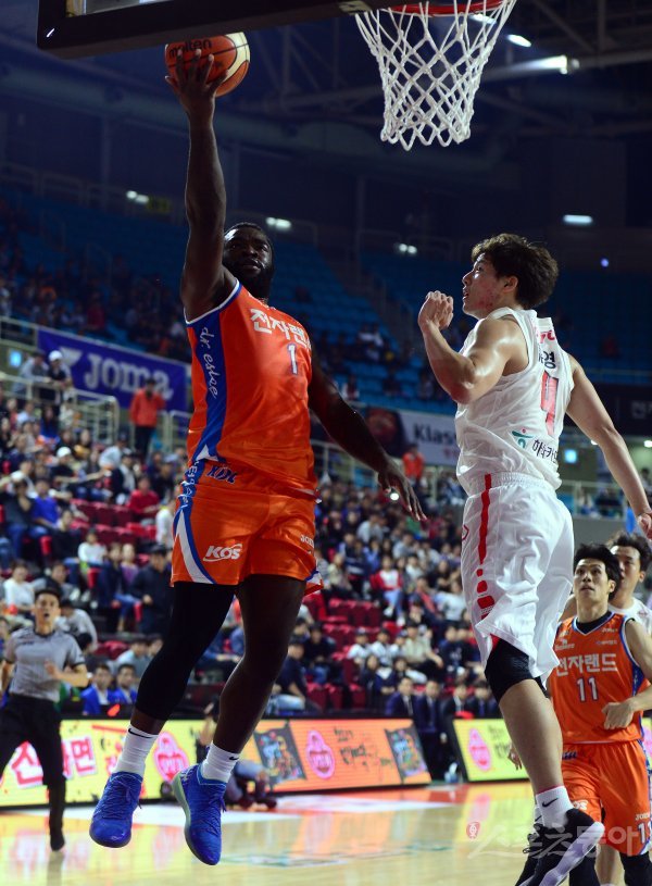 14일 인천 삼산월드체육관에서 열린 ‘2018-2019 SKT 5GX 프로농구’ 인천 전자랜드와 서울 SK의 경기에서 전자랜드 팟츠가 SK 안영준의 수비를 제치며 슛을 쏘고 있다.