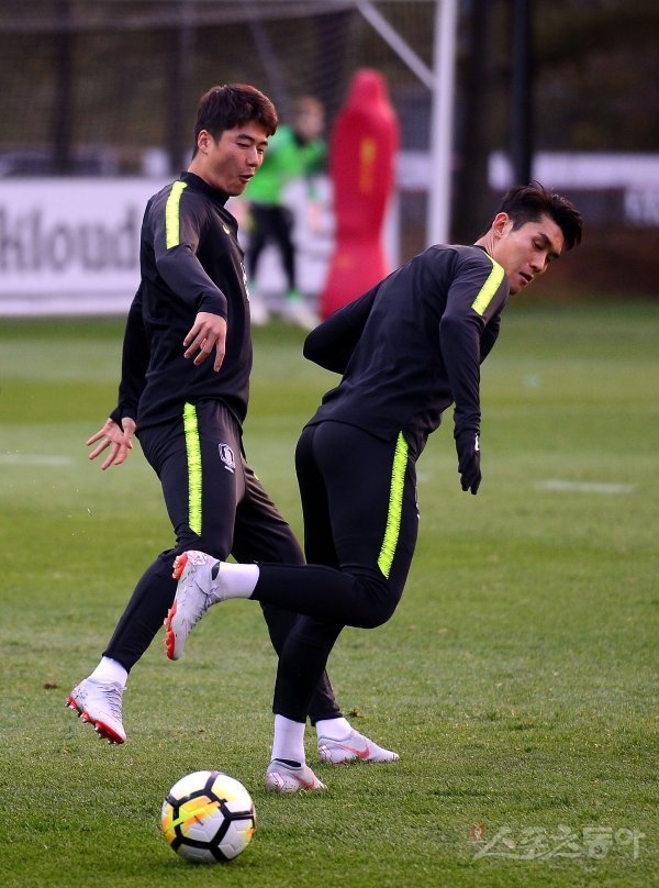 대표팀 기성용과 이용이 볼뺏기게임을 하고 있다.
