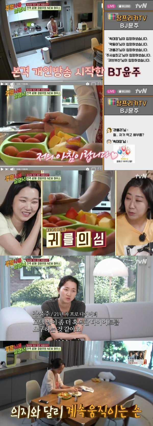 장윤주의 아침식사는 과일과 고구마. 멤버들은 “저게 아침이라고?”라고 당황해했다. 장윤주는 “모델 일이라는 게 다이어트를 혹독하게 해야 한다”라며 “오늘은 화보 촬영이 있어서 더 간단히 먹었다”라고 말했다.
