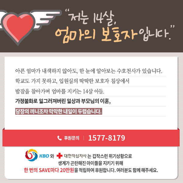 KBO(총재 정운찬)와 대한적십자사(회장 박경서)가 함께 진행하는 사회공헌 프로그램 ‘드림세이브(Dream Save)’의 올해 두 번째 주인공인 차 모 군 가정에 1400만원 후원이 결정됐다.