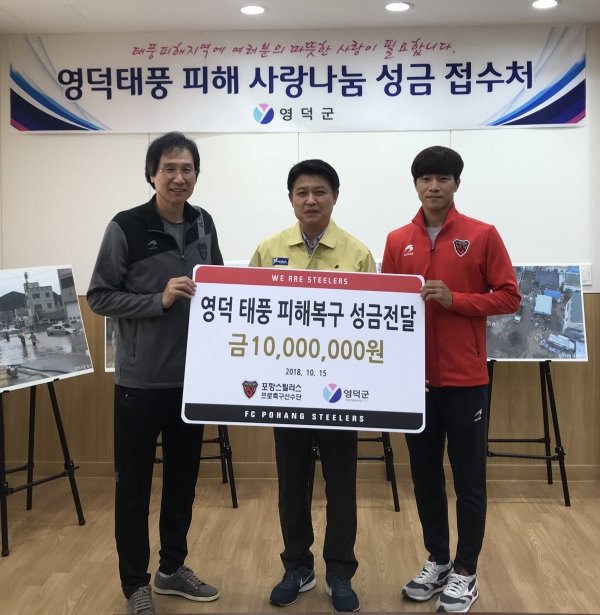프로축구 K리그1 포항스틸러스 선수단이 태풍으로 큰 피해를 입은 영덕군민을 돕기 위한 성금을 영덕군에 전달했다.