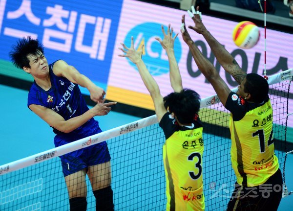 한국전력 서재덕이 OK저축은행 블로커를 피해 스파이크를 날리고 있다.
