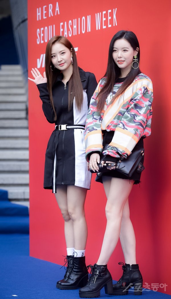 달샤벳 우희와 세리(오른쪽)가 16일 서울 중구 동대문디자인플라자(DDP)에서 열린 2019 S/S 헤라 서울패션위크 ‘바이브레이트 (VIBRATE)‘ 콜렉션에 참석해 포토타임을 갖고 있다.