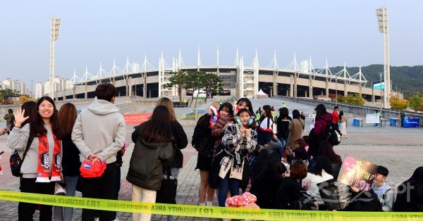 경기에 앞서 축구팬들이 긴 줄을 서서 입장을 기다리고 있다.