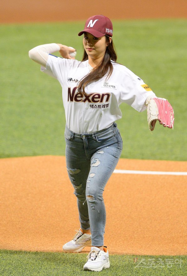 가수 에일리가 경기를 앞두고 열린 시구행사에서 힘차게 공을 던지고 있다.