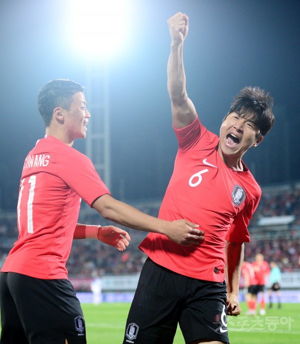 16일 충청남도 천안시 천안종합운동장에서 한국과 파나마의 축구 평가전 경기가 열렸다. 한국 박주호가 골을 넣은 뒤 포효하고 있다.