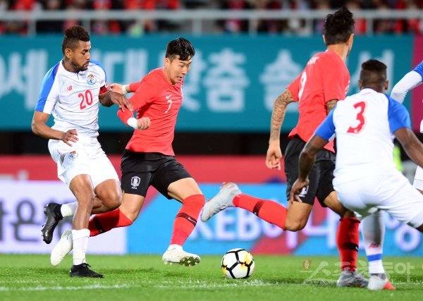 16일 충청남도 천안시 천안종합운동장에서 한국과 파나마의 축구 평가전 경기가 열렸다. 한국 손흥민이 파나마 수비수를 제치며 돌파하고 있다.