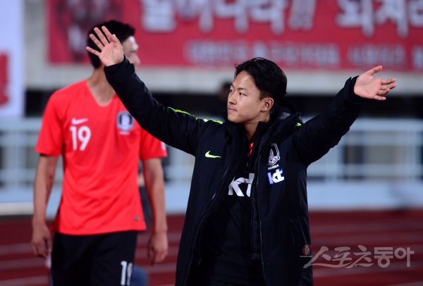 한국이 파나마와 2-2 무승부를 기록한 뒤 이승우가 팬들에게 인사하고 있다.