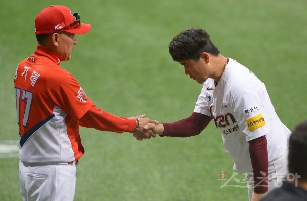 경기 후 KIA 김기태 감독과 넥센 장정석 감독(오른쪽)이 악수를 나누고 있다.