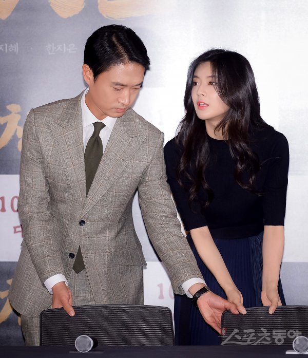 배우 조우진이 17일 서울 송파구 신천동 롯데시네마 월드타워점에서 열린 영화 ‘창궐’ 언론시사회 및 기자간담회에서 이선빈(오른쪽)의 의자를 꺼내주고 있다.