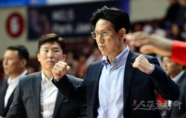 17일 경기도 안양실내체육관에서 열린 ‘2018-2019 SKT 5GX 프로농구’ 안양 KGC와 부산 KT의 경기에서 KT 서동철 감독이 전반전을 앞서자 주먹을 쥐며 환호하고 있다.