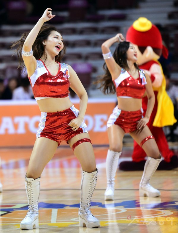 17일 경기도 안양실내체육관에서 열린 ‘2018-2019 SKT 5GX 프로농구’ 안양 KGC와 부산 KT의 경기에서 KGC 치어리더가 화려한 공연을 펼치고 있다.
