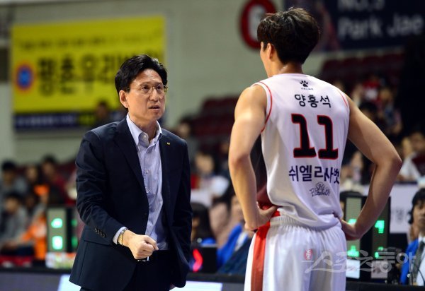 17일 경기도 안양실내체육관에서 열린 ‘2018-2019 SKT 5GX 프로농구’ 안양 KGC와 부산 KT의 경기에서 KT 서동철 감독이 양홍석의 플레이를 지적하고 있다.