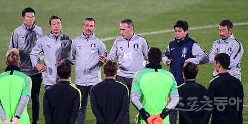 파울루 벤투 감독은 한국 축구국가대표팀 지휘봉을 잡은 이후 다양한 전술 테스트를 진행하며 내년 1월 AFC 아시안컵을 준비하고 있다. 이러한 실험은 완성품을 내놓기 위한 일종의 과정이다. 사진은 파나마와의 평가전을 하루 앞둔 15일 선수들과 미팅하는 벤투 감독(뒷줄 왼쪽에서 네 번째). 스포츠동아DB